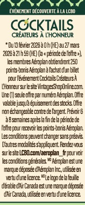 Si vous êtes membre Aéroplan??, vous pouvez également obtenir 250 points-bonis Aéroplan à l’achat d’un billet pour l’événement Cocktails - Créateurs à l’honneur. Offre en vigueur du 13 février au 27 mars 2026, jusqu’à épuisement des stocks. Des conditions s’appliquent*. Faites vite! Cet événement exclusif affichera rapidement complet.
